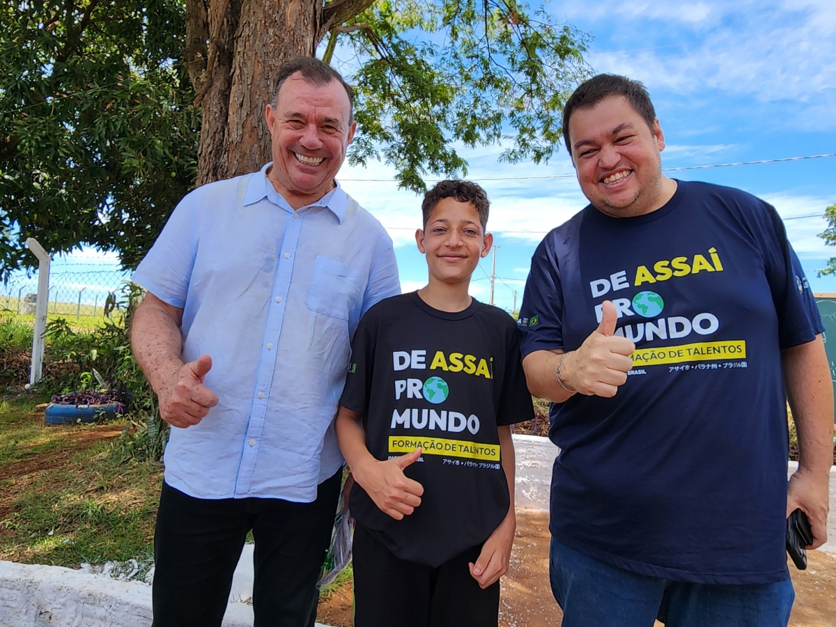 O Prefeito Tuti, o Secretário de Ciência, Tecnologia e Inovação, Igor Oliveira, e o aluno Luiz Guilherme, selecionado para representar Assaí na Missão Internacional em Portugal pelo programa De Assaí Pro Mundo, tiveram uma conversa com todos os alunos.